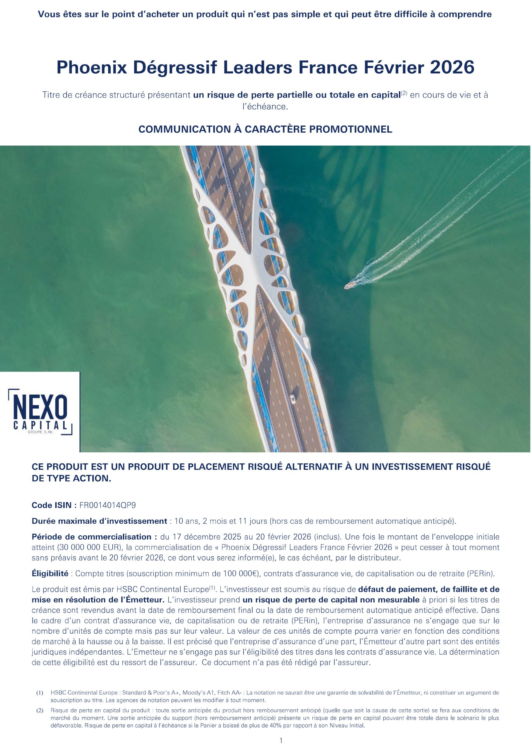 Protection du capital : risque de perte en capital partielle ou totale en cas de dégradation de la qualité de crédit de l’émetteur et de faillite, de défaut de paiement ou de mise en résolution de l’émetteur.